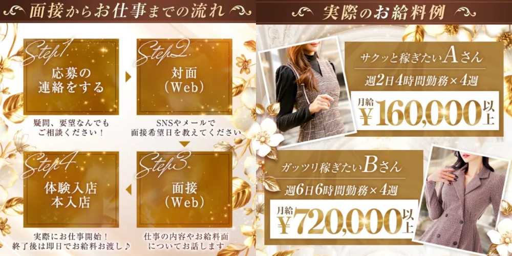日給目安¥30,000 ~ ¥60,000歩合率60% ~ 80%最低保証あり¥7,000 ~ ¥12,000お友達紹介ボーナス¥50,000入店お祝い金あり